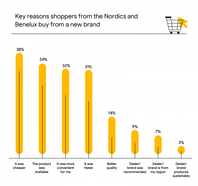 Mens begge disse faktorer stadig er til stede i dag, er ’tilgængelighed’ markant faldet i betydning, og ‘kvalitet’ og ‘leveringshastighed’ er steget kraftigt. Andre grunde der viste en stigning i 2021, er ‘bekvemmelighed’ og ‘brand anbefalinger’.
