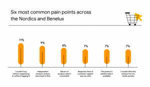 42% af befolkningen i Norden og Benelux der handlede online i 2021, oplevede “pain points”, altså udfordringer og irritationsmomenter, i forbindelse med deres handel. Her var tallene noget mindre i 2020 og 2019, som var på henholdsvis 31,5% i 2020 og 26,5% i 2019.