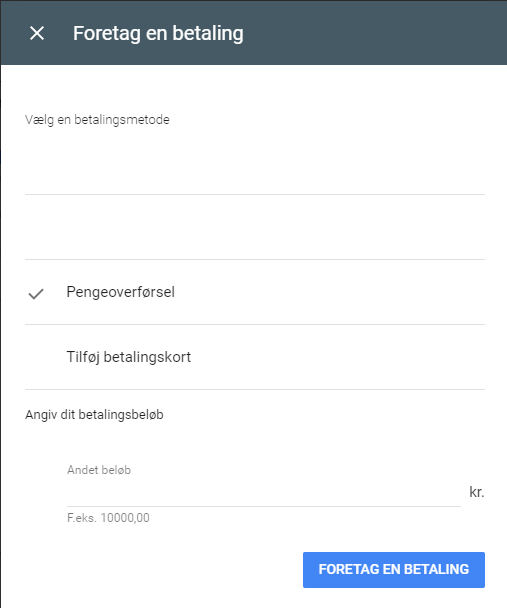 – Indtast herefter det ønskede beløb som skal overføres til kontoen, eller vælg (Betal udestående)